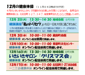 12月健康体操のご案内 2025/12/3 お知らせ, お知らせ(福祉委員会), 今月の予定・年間活動計画, 連絡事項・今月の予定 2025年12月の健康体操は下記日程で開催いたします。 ご参加よろしくお願いします。