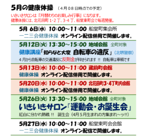 5月健康体操のご案内 2026/4/27 お知らせ, お知らせ(福祉委員会), 今月の予定・年間活動計画, 連絡事項・今月の予定 2026年5月の健康体操は下記日程で開催いたします。 ご参加よろしくお願いします。